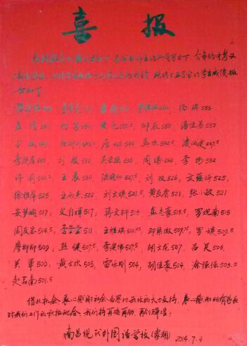 繼首屆畢業生中考取得佳績后,南昌現代外國語學校象湖校區中考再傳捷報!日前,南昌市2014年中考成績正式公布,南昌現代外國語學校象湖校區學子大顯實力,在今年中考中凱歌高奏,取得了振奮人心的好成績:程海怡同學以584分的成績刷新了該校中考成績最高分紀錄,這一成績在南昌市2014年中考第五考區的17所學校中名列前茅。李紫雯、李超、李雅琪同學分別以573、566、564.5的高分,和程海怡一同被江西師大附中錄取。此外,李超、萬斌同學在此次中考中取得了化學單科滿分的好成績。