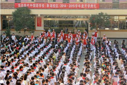 9月5日上午8時,南昌現代外國語學校(象湖校區) 的操場上鼓樂齊鳴,全體師生齊聚一堂,隆重舉行了2014新學年的開學典禮,學校校長李金玉等校領導及部分師生參加此次典禮。