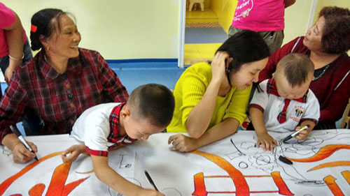 小朋友和老師家長們共同在畫紙上揮動手中的畫筆。看,小朋友們個個認真、專心畫畫的模樣,多可愛啊!