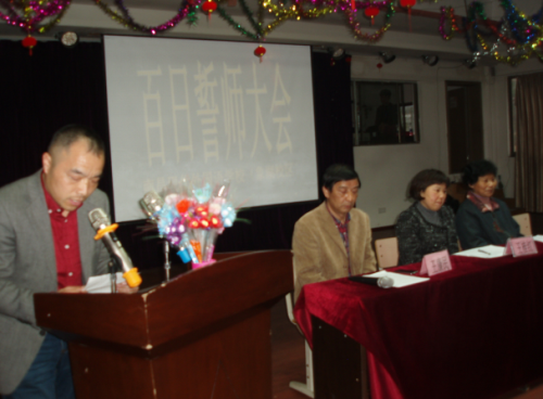 緊接著,教師代表陳一鳴老師在會上作了激情洋溢的講話道出全體老師的心聲:愿與同學們一道攻堅克難,奮戰(zhàn)百天,甘心做學生成長成功的鋪路石。在陳老師富有激情的發(fā)言后,全體的初三教師個個斗志昂揚,在主席臺大聲宣誓,明確了作為教師的責任和目標。同時,家長代表的發(fā)言更是讓我們感受到了社會對我們學校工作的支持與認可。接著優(yōu)秀學生代表焦慧婷同學做了表態(tài)發(fā)言,暢談自己的學習方法與經驗,決心遵照學習計劃,珍惜最后的寶貴學習時光,奪取優(yōu)異成績。