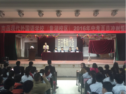 陽春三月,春寒料峭,憧憬六月,激情滿懷。為鼓舞初中畢業(yè)班學生的斗志,讓他們揚起自信的風帆,信心百倍的迎接中考,2016年3月8日下午,南昌現代外國語學校(象湖校區(qū))隆重舉行“2016年中考百日沖刺誓師大會”,學校行政領導,初三全體教師、同學及家長代表500余人參加了這次大會。