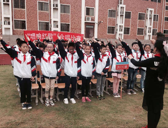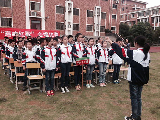 比賽當天,同學們著裝整齊,飽含激情,用自己高亢嘹亮的歌聲歌唱祖國,頌揚祖國。參賽曲目分為必唱歌曲和自選歌曲。在主持人精彩的開場白后,比賽正式拉開了帷幕。首先,由六年級組集體合唱“沒有共產黨就沒有新中國”,歌聲氣勢豪邁,慷慨激昂,唱出了生活在幸福中的孩子們對祖國的感激。接著,各個班級互相拉歌,“紅星閃閃”、“少年,少年,祖國的春天”、“歌唱祖國”……一首首耳熟能詳的紅色歌曲回蕩在校園的上空。嘹亮的歌聲激起了師生對歷史歲月的追念,激昂的旋律觸動了師生感恩祖國的心弦?;顒幼詈螅钚iL對本次“唱響紅歌”合唱比賽作出了高度評價,年級組評出了一、二、三等獎。