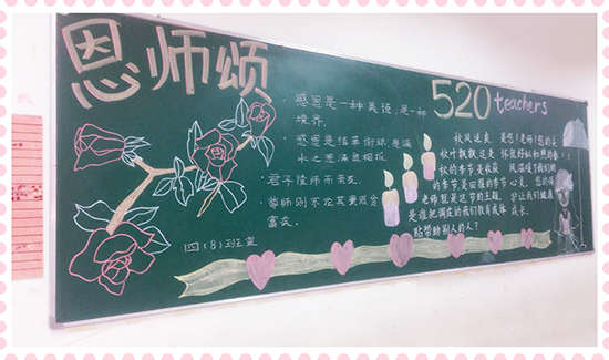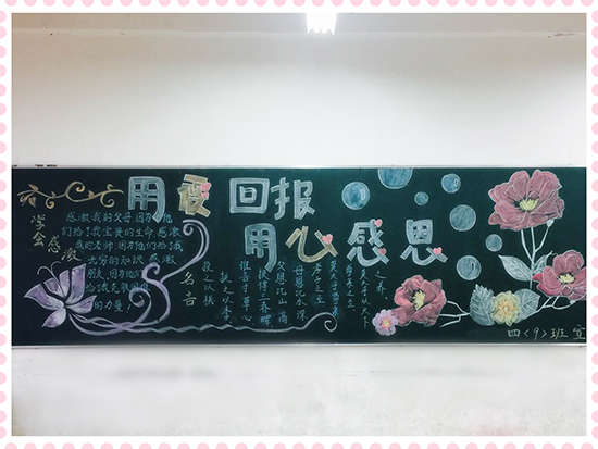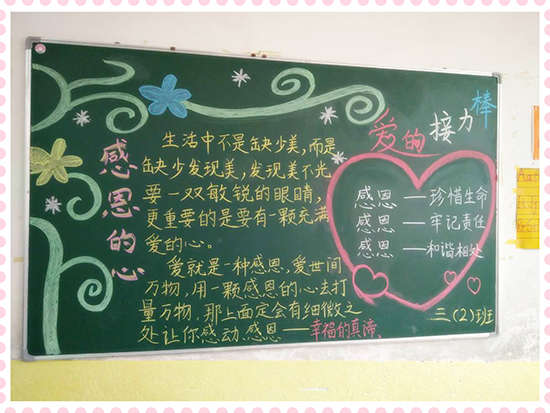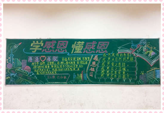 本期黑板報美觀靚麗,精彩紛呈,讓同學們通過參與,懂得了感恩的重要,懂得了怎樣去感恩別人,學會了對父母、學校、社會心懷感激之情,為校園文化增添了一道亮麗的風景線。