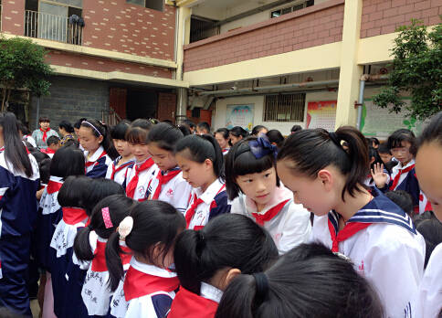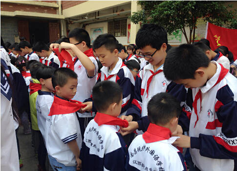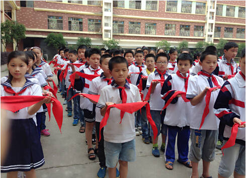 六年級隊員準(zhǔn)備為新隊員佩戴紅領(lǐng)巾