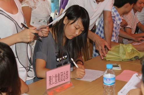 有了上午的體驗,在下午的招聘現場,更是人頭攢動。學生們熱情高漲,多家單位的招聘人員被大家團團圍住。前來參加招聘會的同學手中幾乎都拿了多份簡歷,他們認真地詢問與自己專業對口的崗位并慎重地將簡歷投向心儀的企業。經濟貿易系的張珍同學說:“這次學院舉行實習招聘推介會,為我們提供了大量實習崗位,對我們來說是一次選擇就業極好的機會。參加招聘會的招聘,對我們也是一次就業招聘的實際鍛煉,我一共投了3份資料,特別看中聚仁堂集團總部的財務審計助理崗位,想去試試。”