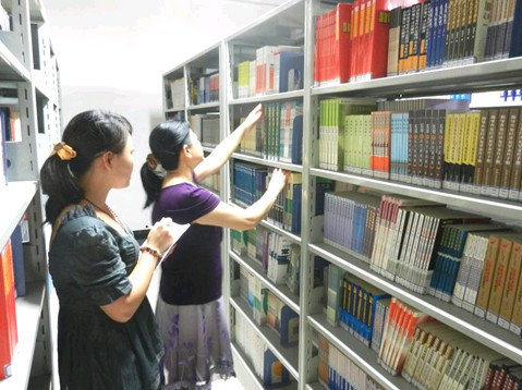 圖為資產檢查人員對工商學院圖書館圖書進行抽盤